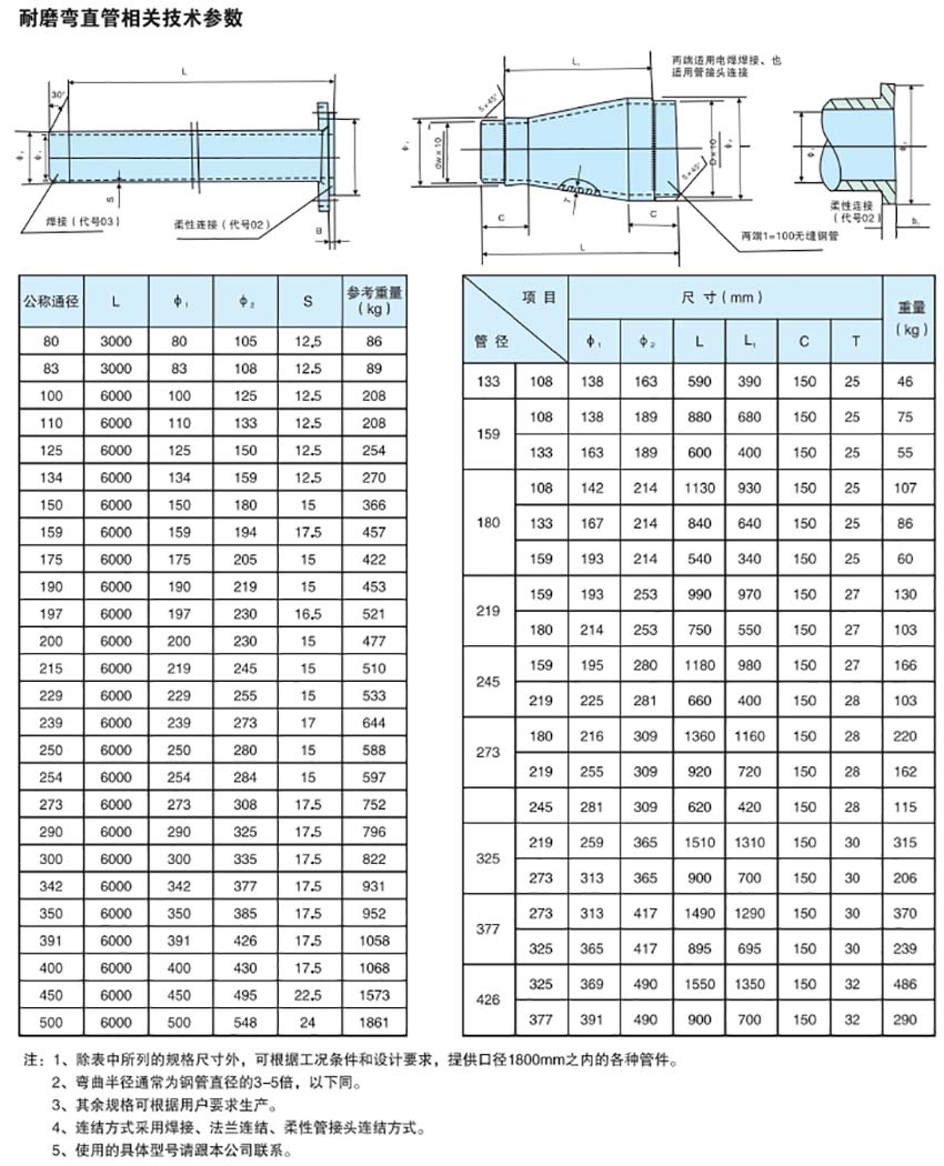 在同等條件下與高錳鋼材料相比,其單位磨耗是高錳鋼的 1 / 3 左右,使用壽命是高錳鋼的 2 一 3 倍,彎管和分支管可與無縫鋼管段配套使用,安裝、維修更方便。